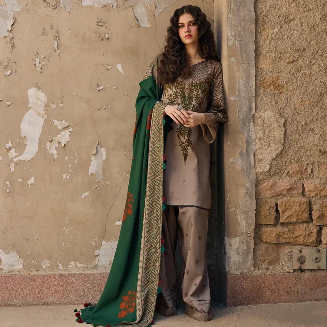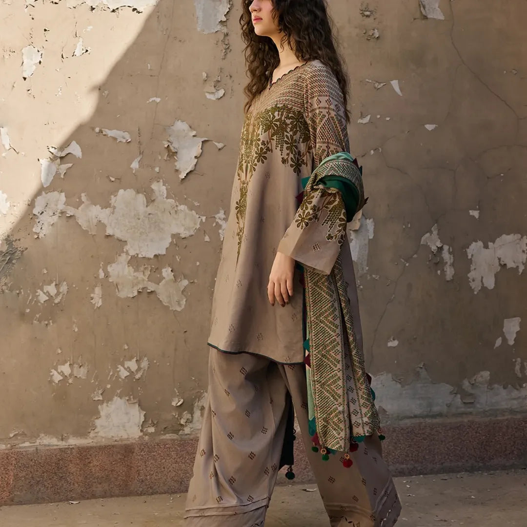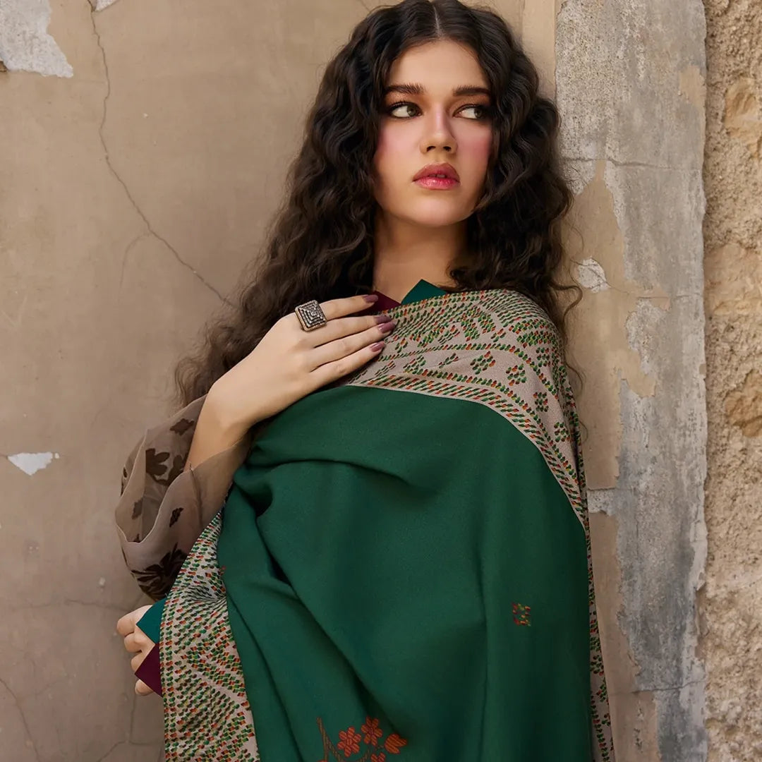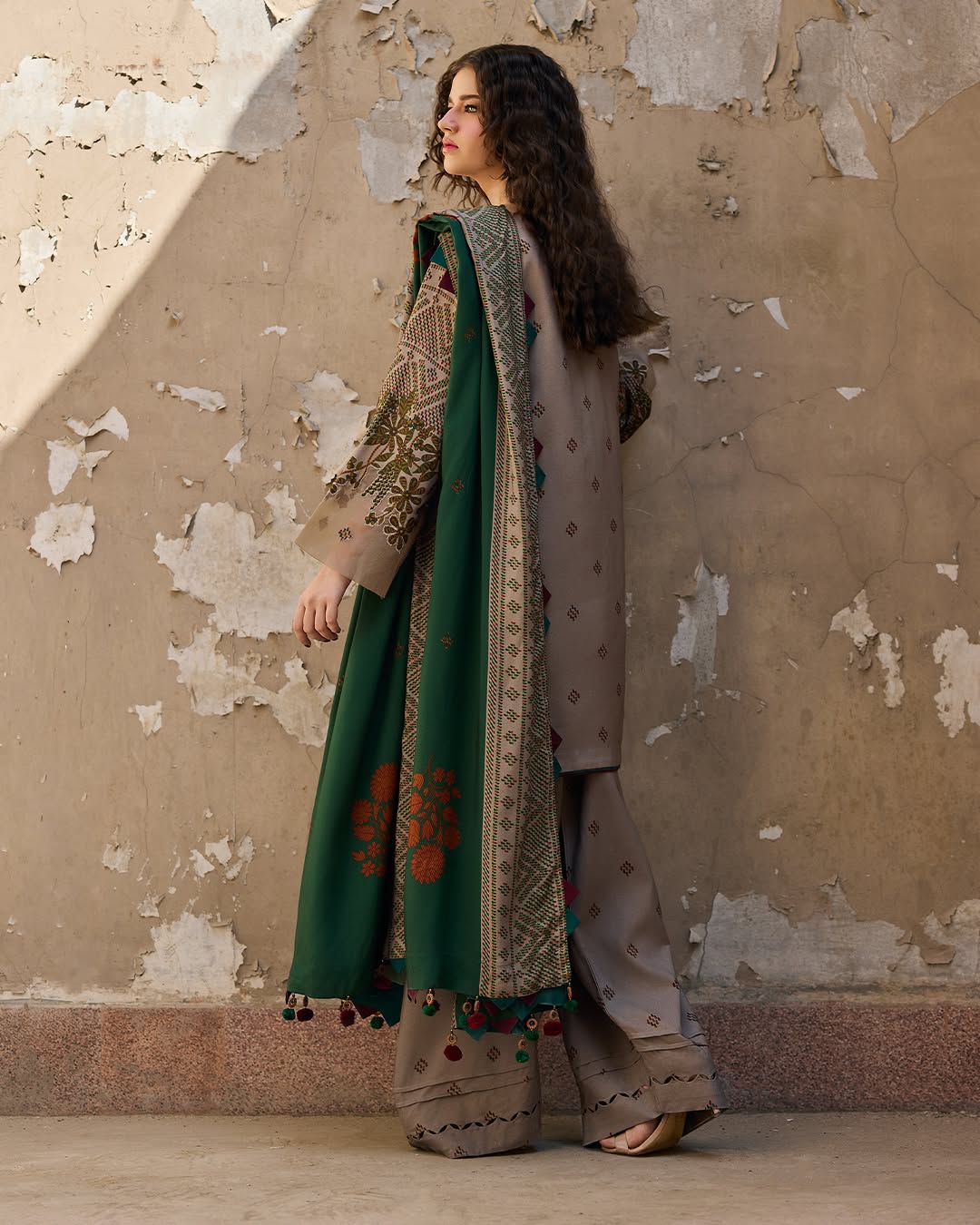 The matching silk trousers are printed with subtle motifs to create a balanced and classy look. It comes with a contrast green dupatta, adding a refreshing touch and completing the outfit perfectly.
